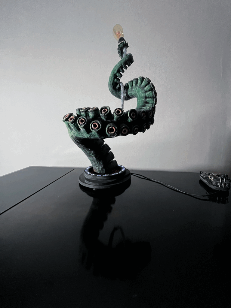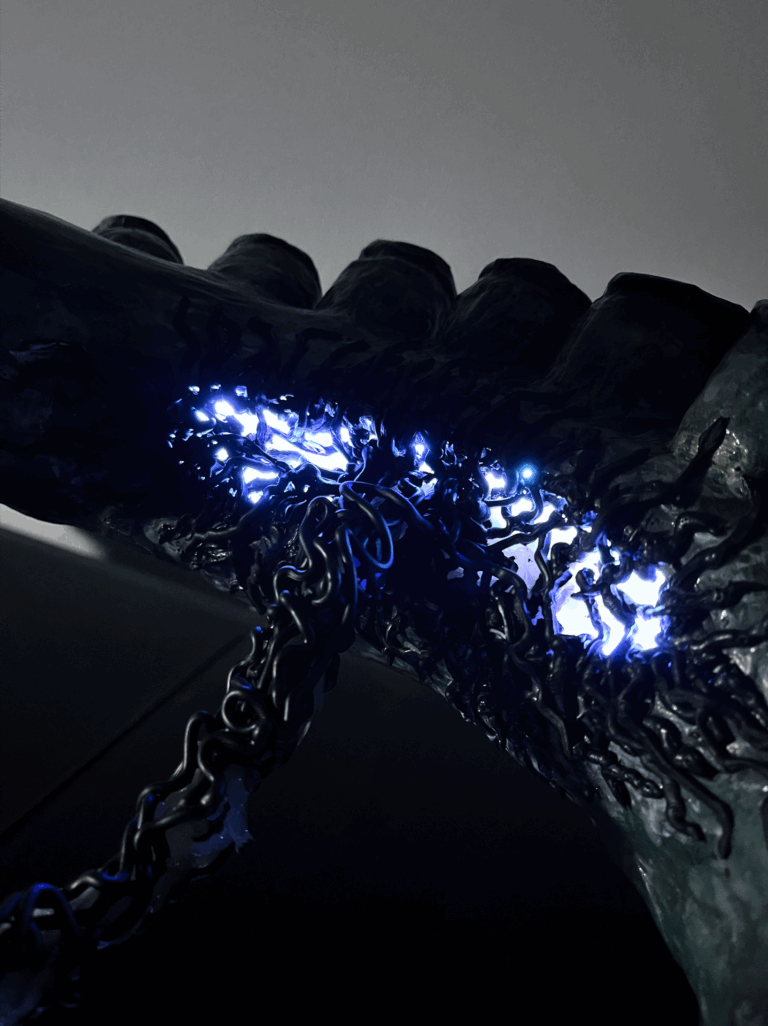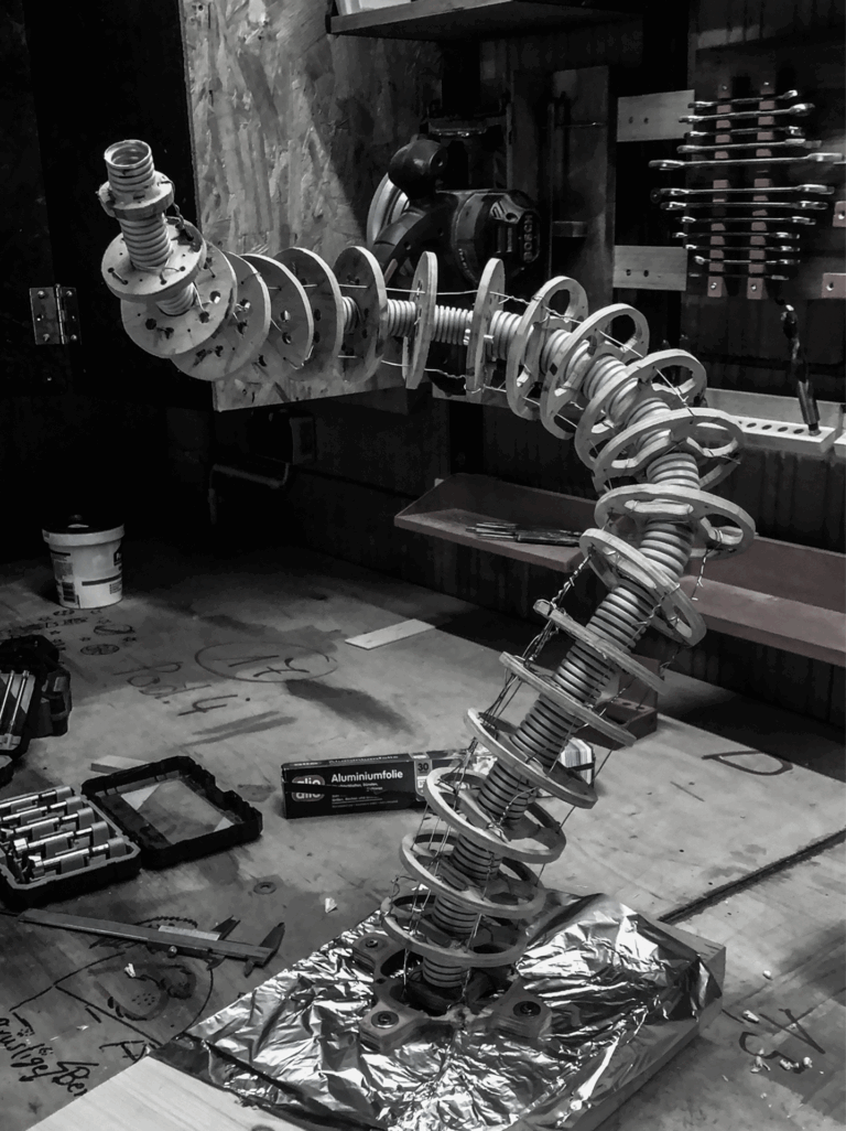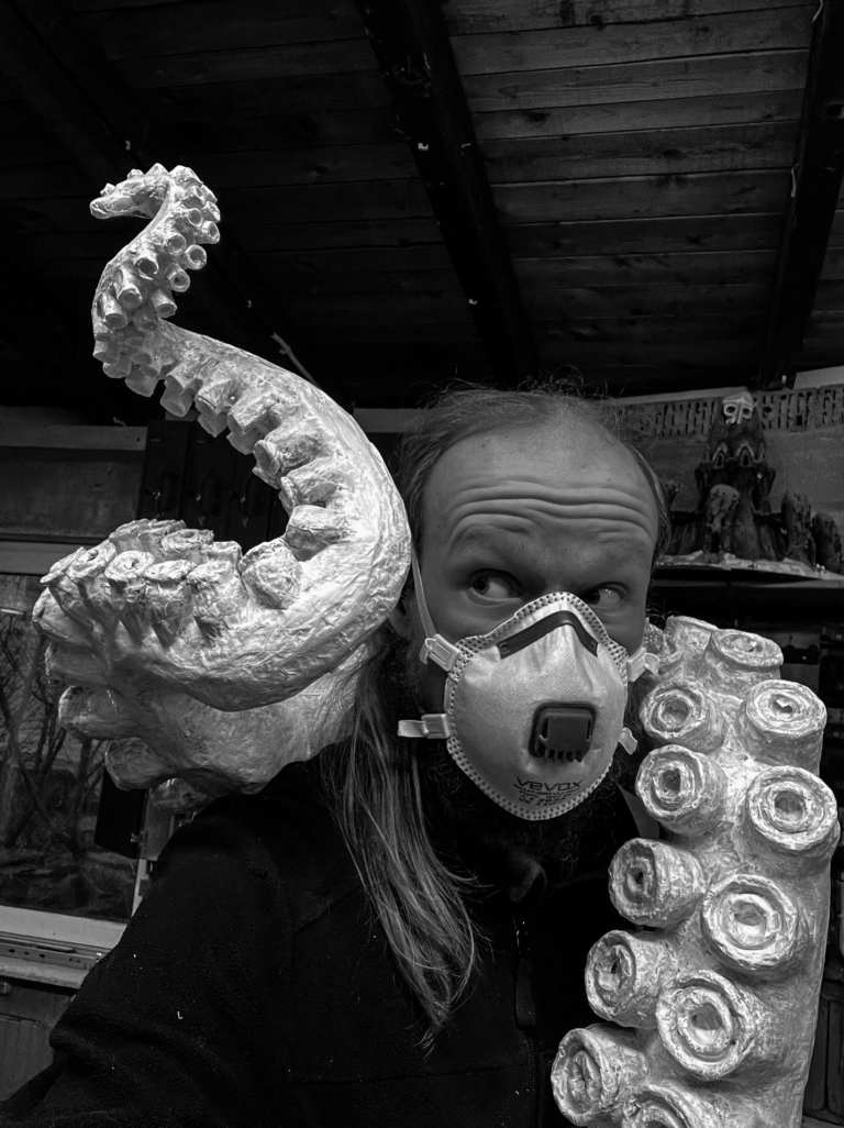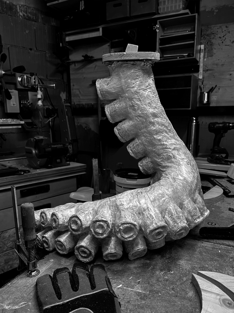 Die Stützstruktur wird von einem ausrangierten animatronischen Tentakelarm aus einem früheren Projekt gebildet. Wo damals die Zugseile durchgefädelt waren, halten nun Drähte den gesamten Arm in der Pose. Die Hohlräume zwischen den Spanden wurden mit Pappmachee ausgefüllt.