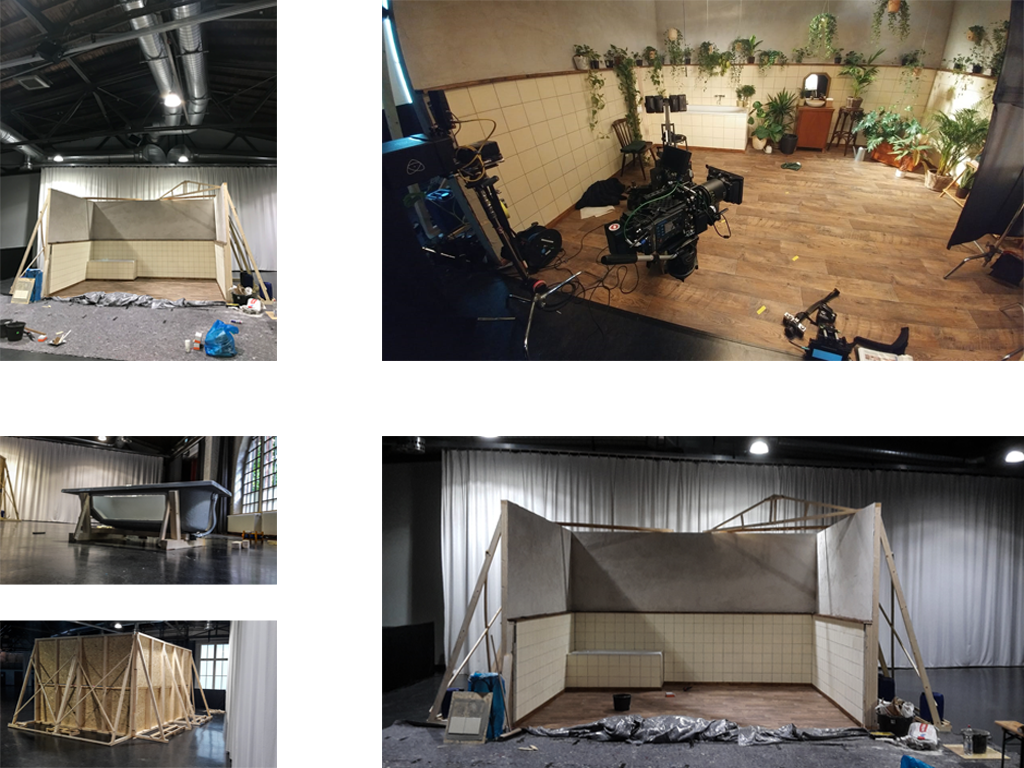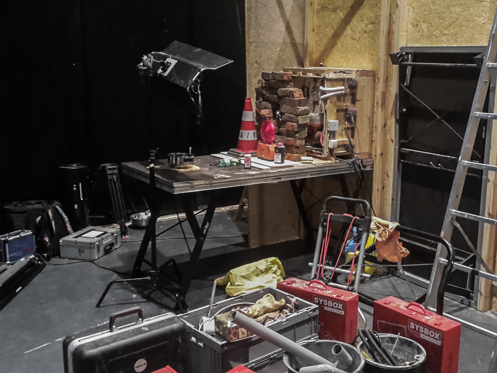 Um das gesamte Gebilde in den Setbau zu integrieren wurden die Übergänge zur Kulisenwand mit jeder Menng Farbe und Putz kaschiert.