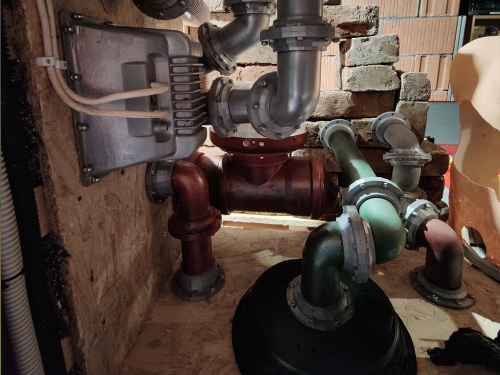 In einen bestehenden Setbau sollte eine ominöse Maschiene aus Rohrleitungen und Behältnissen eingebaut werden.