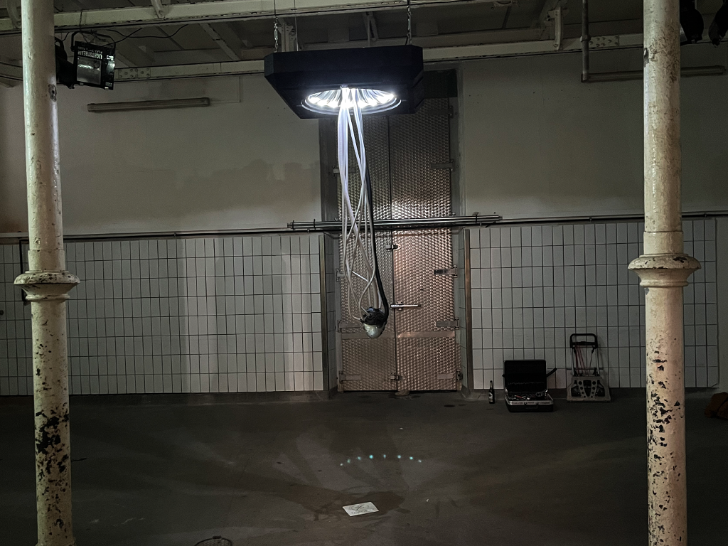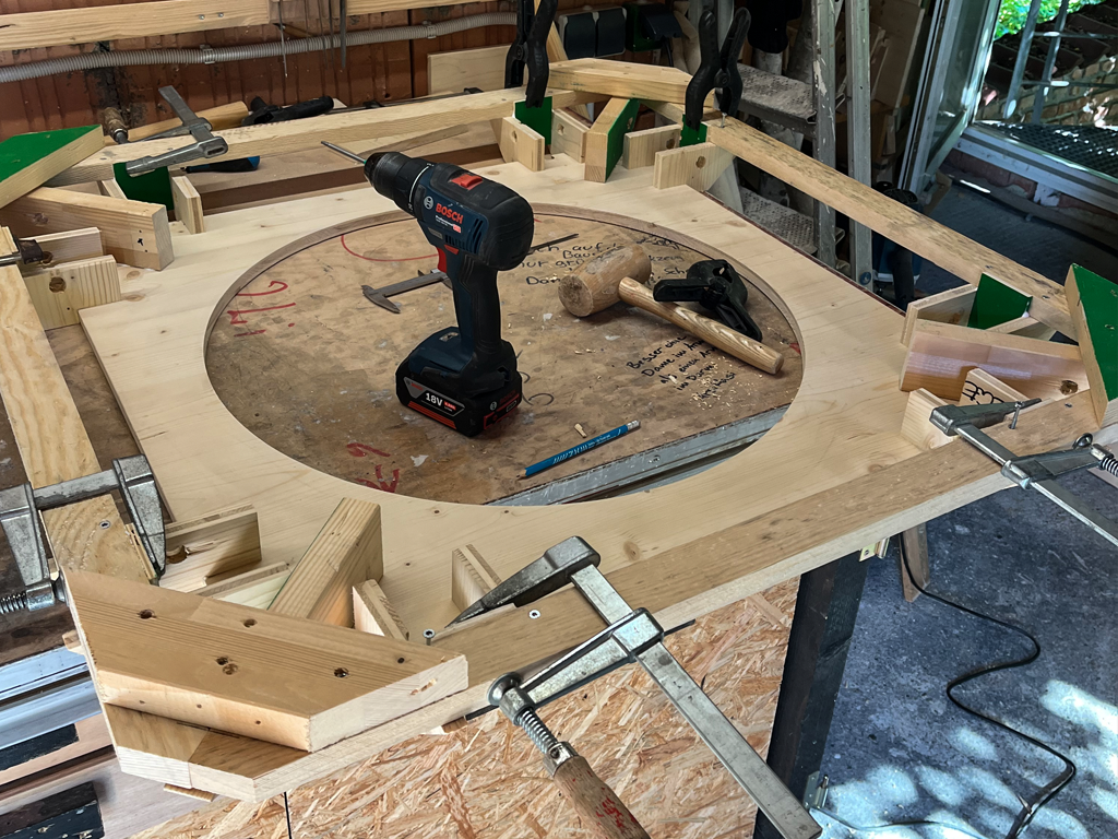 Das ist der Quader für meine Installation „The Algorythm Fear“, welche ich auf dem Cyb.orx Festival 2025 in Tübingen ausstellen durfte. Für den Bau kamen überwiegend 3 Schicht Platten, sowie Sperrholz und Reste von Balken zum Einsatz.