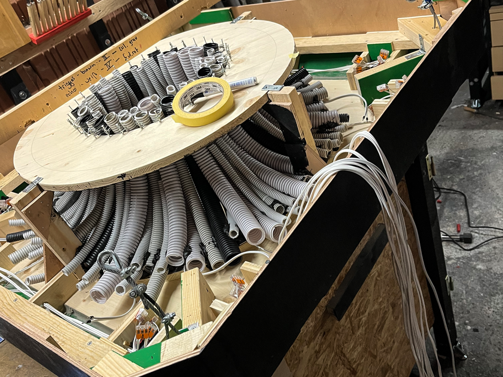 Gewöhnliche Rohre aus dem Baumarkt, jede Menge Kabel und Teile aus dem Elektroschrott wurden hierfür kombiniert mit Flanschen aus dem 3D Drucker und Farbe.