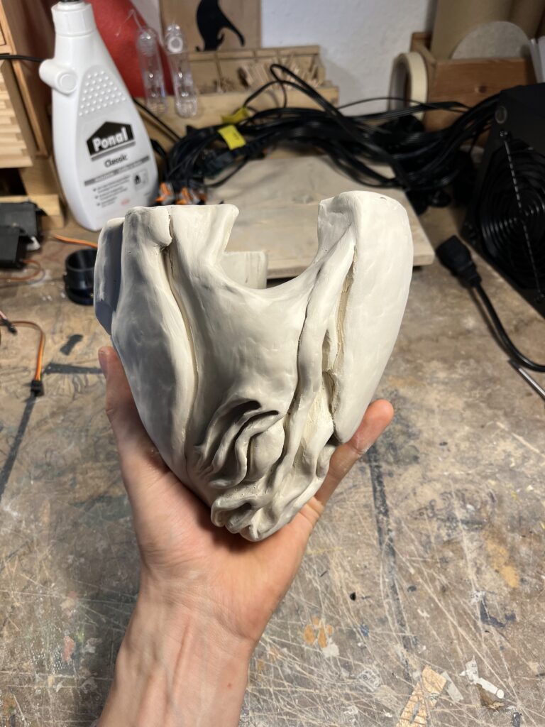 Beim Modellierungsprozess kristallisierte sich heraus, dass die Darstellung eines anatomisch korrekten Herzens nicht zu meinem Stil und dem, was ich darstellen möchte, passt. Die Idee von einem zerfurchten Organ, das mit dicken Adern und Kluften durchzugen ist und dessen stückweise geglättete Oberfläche ein interessantes Zusammenspiel von Ordnung und Chaos erzeugt, gefiel mir weitaus besser.