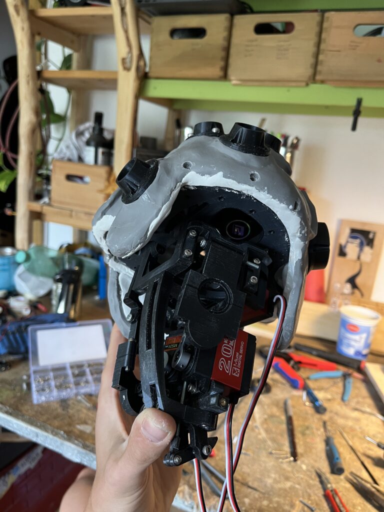 Hier zu sehen ist eine frühere Version der Animatronik. Im Verlauf wanderte der Servo für die untere Klappe ganz nach oben, damit die Silikonform unten schön konisch zulaufen kann.
