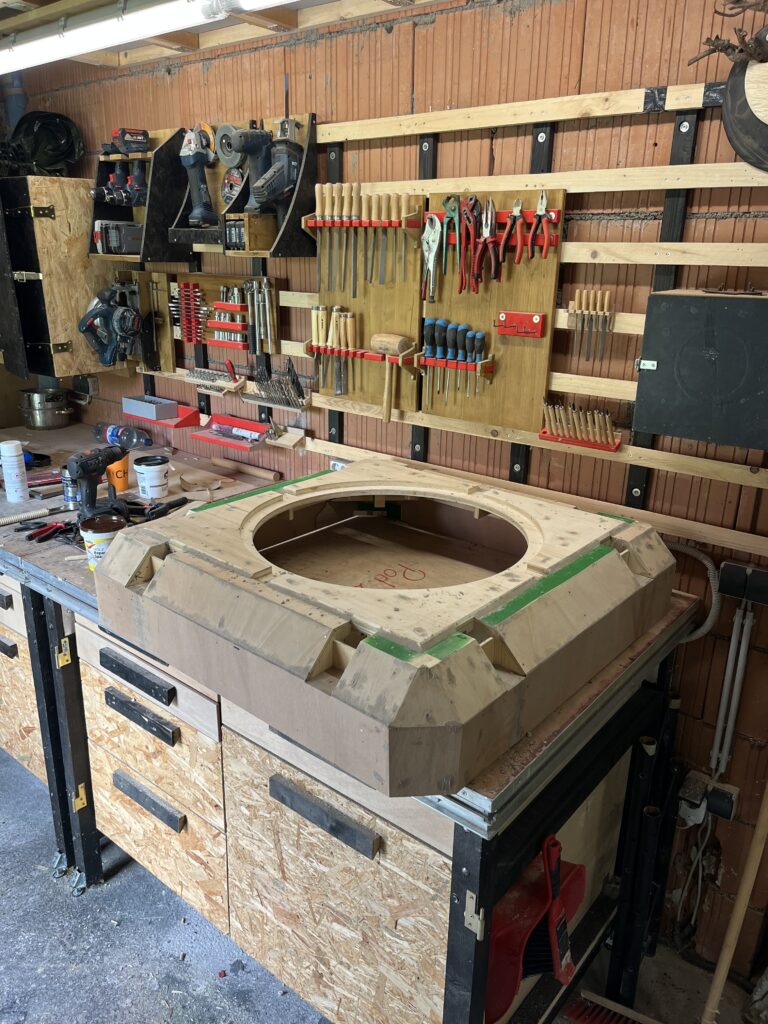 Für die das Äußere nutze ich eine ofenhärtende Polymer Modelliermasse, die ähnlich wie Ton verarbeitet werden kann und erst nach dem Backen ausgehärtet ist. Sie lässt sich also so lange wie gewünscht bearbeiten. Zusätzliche Stabilisation des Deckels und die passenden Formen zum Montieren der Mechanik am Rand, erzeugte ich mit Epoxid Harz Knete, welche eine höhere mechanische Belastbarkeit aufweist.