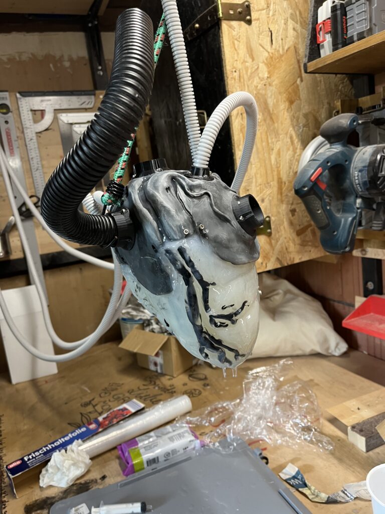 Beim Verbinden aller Komponenten des Herzens miteinander war viel Fingerspitzengefühl gefragt. Zunächst musste das Silikonherz an die Mechanik angeschlossen werden. Hierfür wurde das Silikon in der exakten Position über die Klappen gezogen und direkt im Anschluss der Rand in den Klemmen verspannt. Anschließend mussten alle Kabel aus den Schläuchen mit den Verbrauchern im Herzen verbunden werden. Das sind 3 Servomotoren, Zwei Lüfter, das Leuchtmittel und der Temperatursensor. Zum Schluss wurden Deckel und Herz miteinander verschraubt.