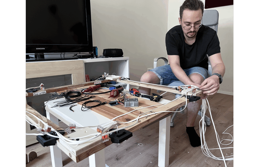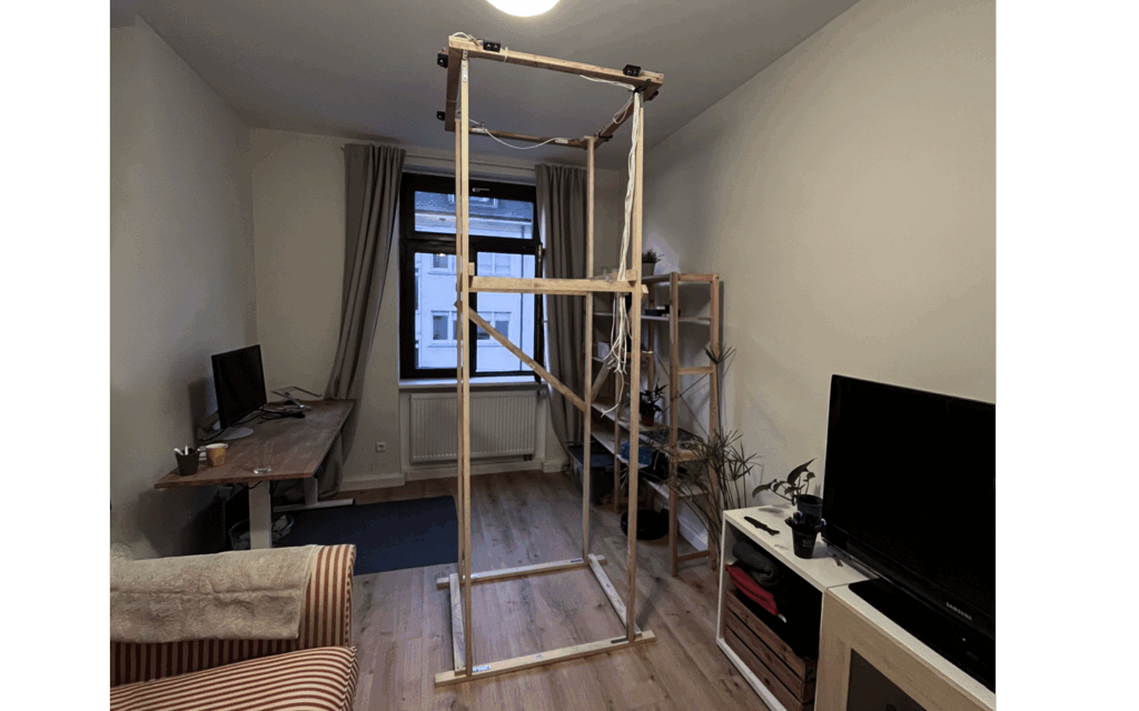 Zum Anlernen der Sensoren errichteten wir in seinem Wohnzimmer einen Quader, der die Lage der Sensoren wie sie später auch im Kubus sein würde, exakt nachstellte. Zusätzlich montierten wir Servos, die den Herzschlag simulieren würden. So hatten wir ein Testsystem geschaffen, mit welchem die Software ständig neu angepasst und abgerundet werden konnte.